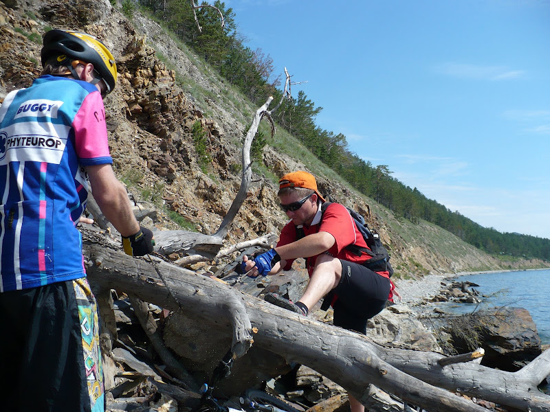 При этом справа обрыв около 20 метров в Байкал, а слева не менее крутая